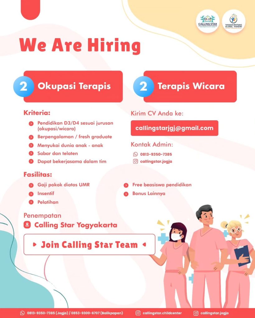 Calling Star akan terus mencari dan menerima lulusan-lulusan terbaik untuk bergabung dengan kami seperti Terapis Okupasi, Terapis wicara, fisioterapis, Psikolog, Dokter biomedical, Special Educator.